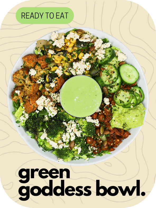 marinated kale, romaine lettuce, corn & poblano mix, falafel, roasted marinated chickpea, cucumber, house guacamole, roasted broccoli, tofu feta, jalapeno, parsley, toasted pepitas
